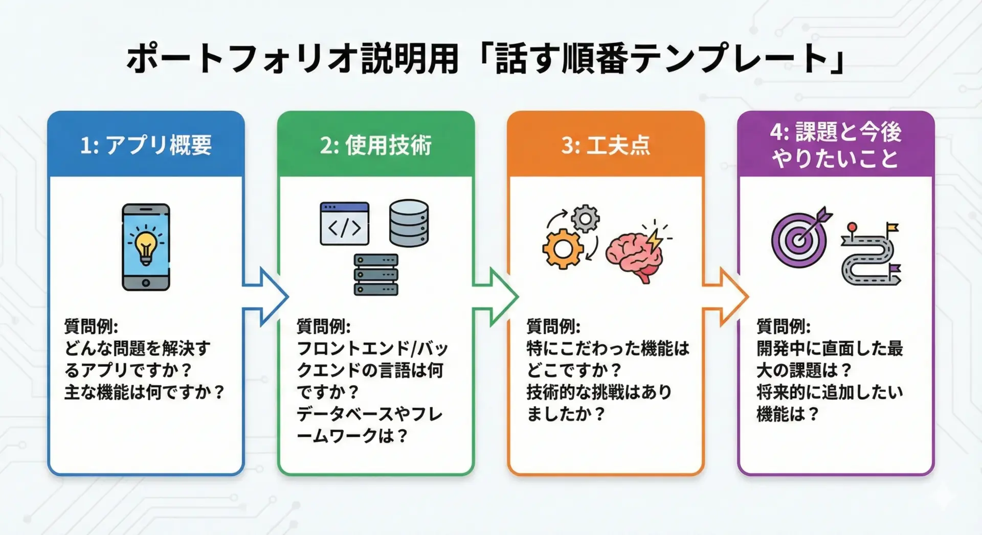 面接でポートフォリオを説明するとき、「作りました」で終わらせないことが大切です。