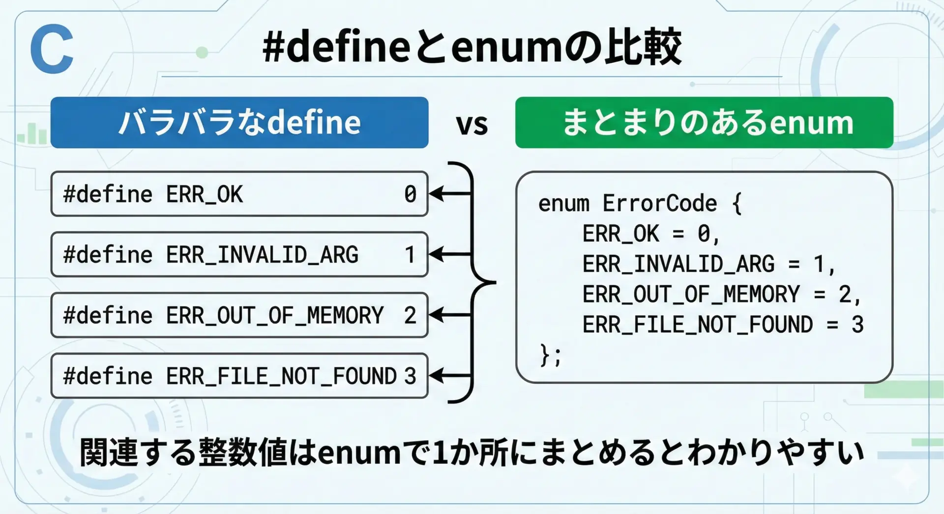 このように、「関連する整数の定数が複数ある場合」は、#defineよりもenumの方が構造化された表現になりやすいです。