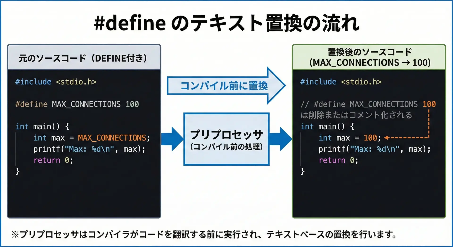 #defineはプリプロセッサディレクティブであり、コンパイルの前段階で行われるテキスト置換の仕組みです。
