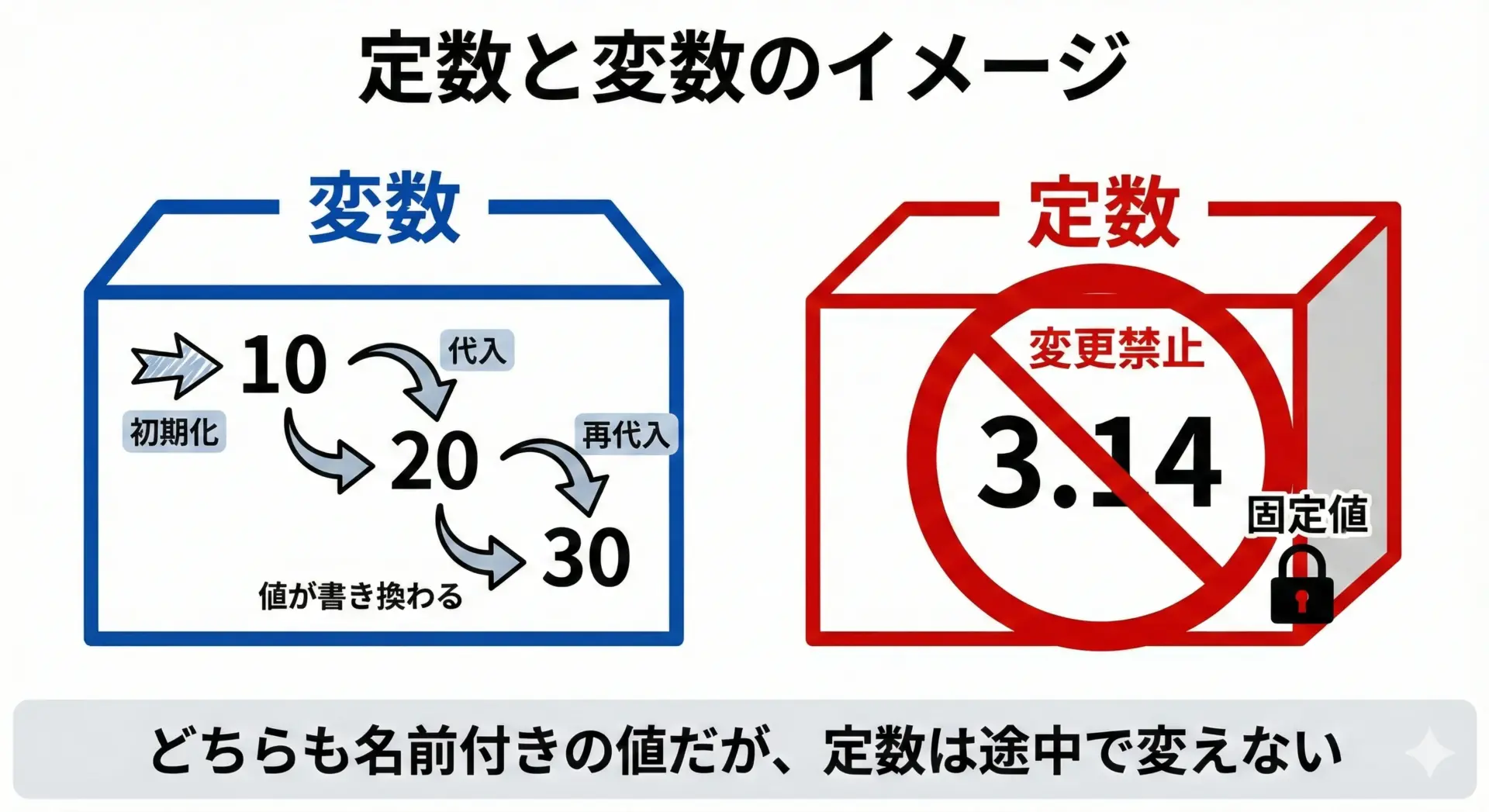 また、定数は誤って値を書き換えることを防ぐという意味でも重要です。