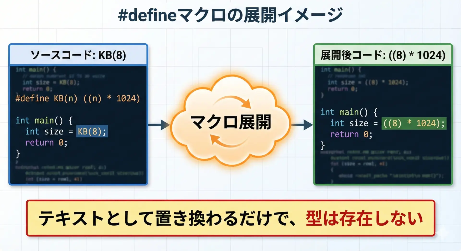 #defineマクロ定数#define BUFFER_SIZE 1024コンパイル前に文字列置換される、型を持たない