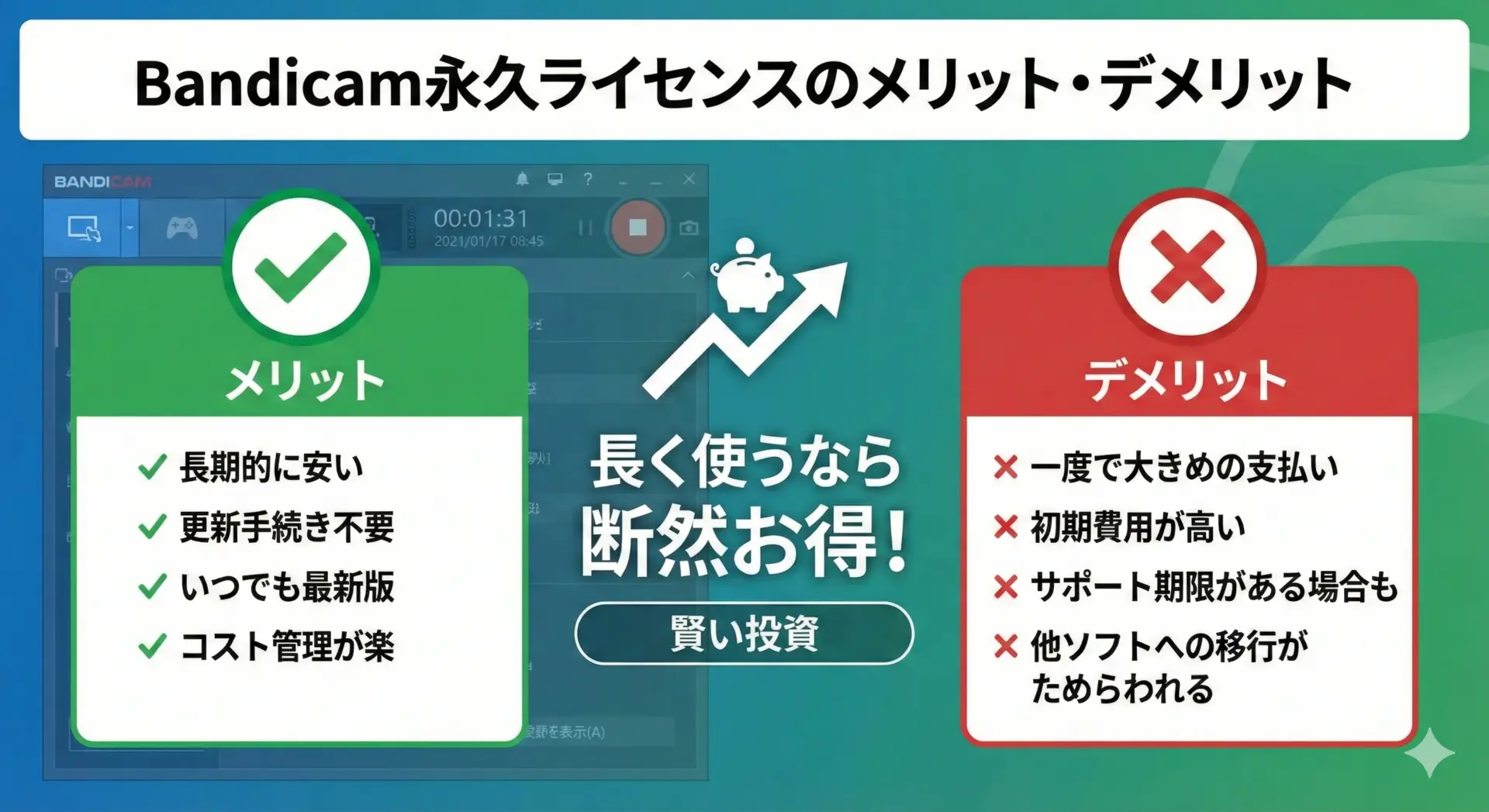 「Bandicamを買うなら、永久ライセンスと年間ライセンスのどっちがお得なんだろう?」と迷っていませんか?