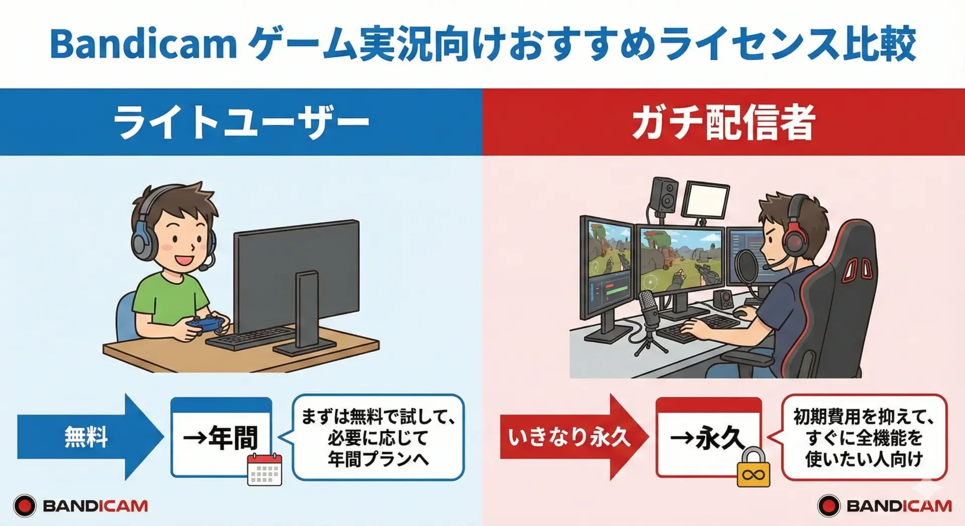 ゲーム実況・配信でBandicamを使う場合、「どのくらい本気で続けるか」がライセンス選びの決め手になります。