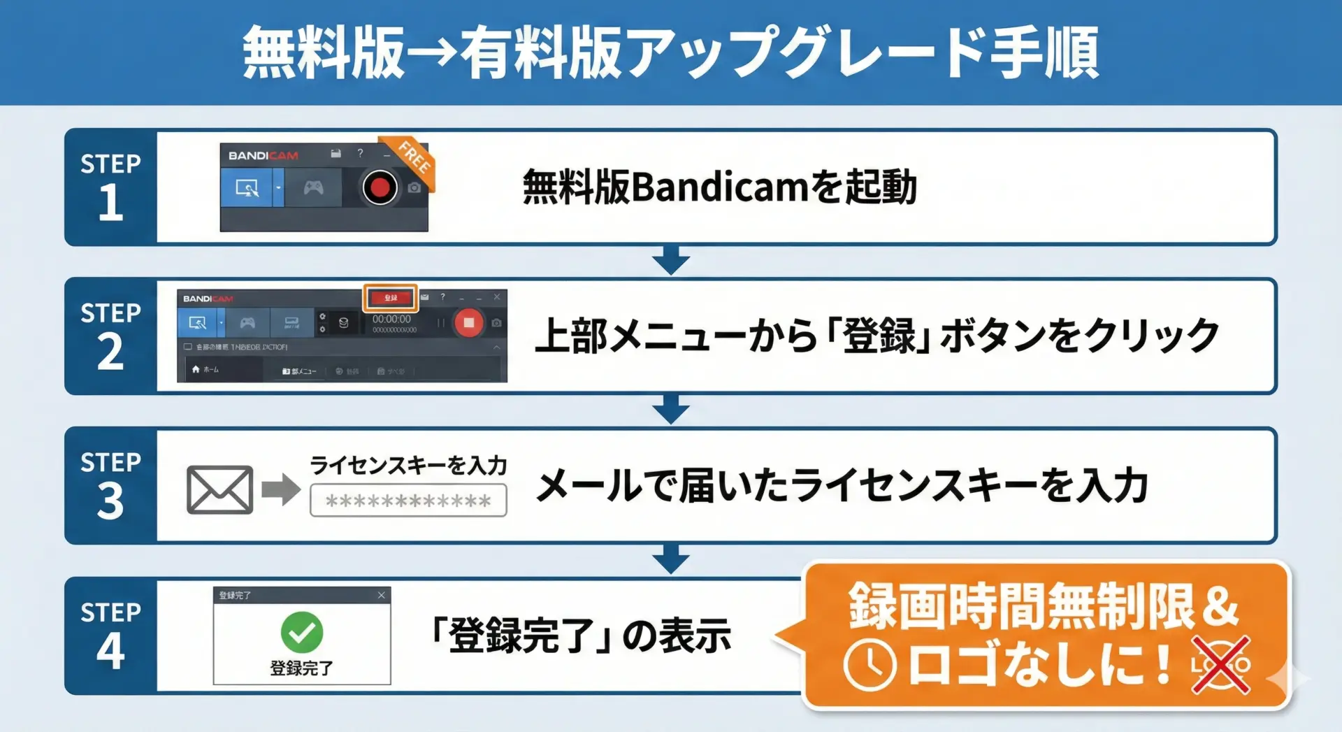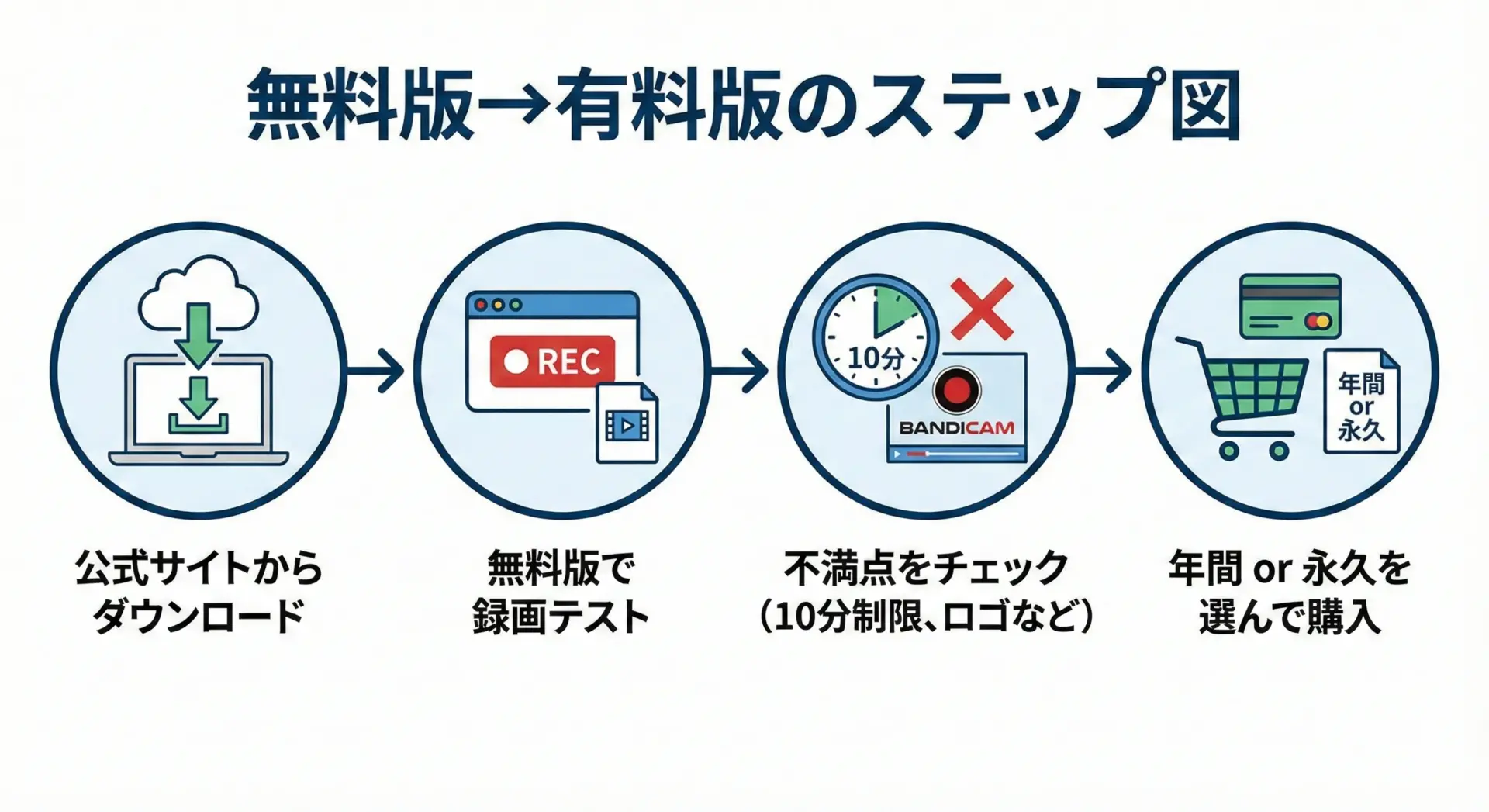 Bandicamのライセンス体系を、まずはシンプルに整理すると次の3ステップになります。