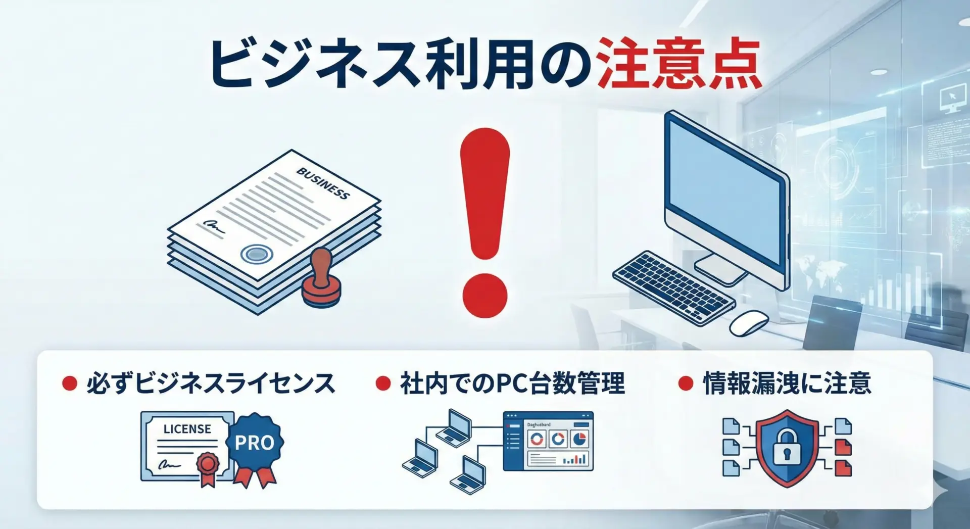 - 仕事や社内で使うなら、必ずビジネス用ライセンスを選ぶ