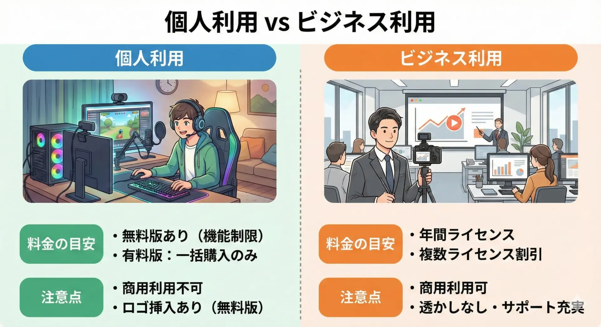 一方で、ビジネス利用は、会社のマニュアル作成、社内研修動画、クライアント向け資料動画など、仕事として収益活動に組み込まれる使い方です。
