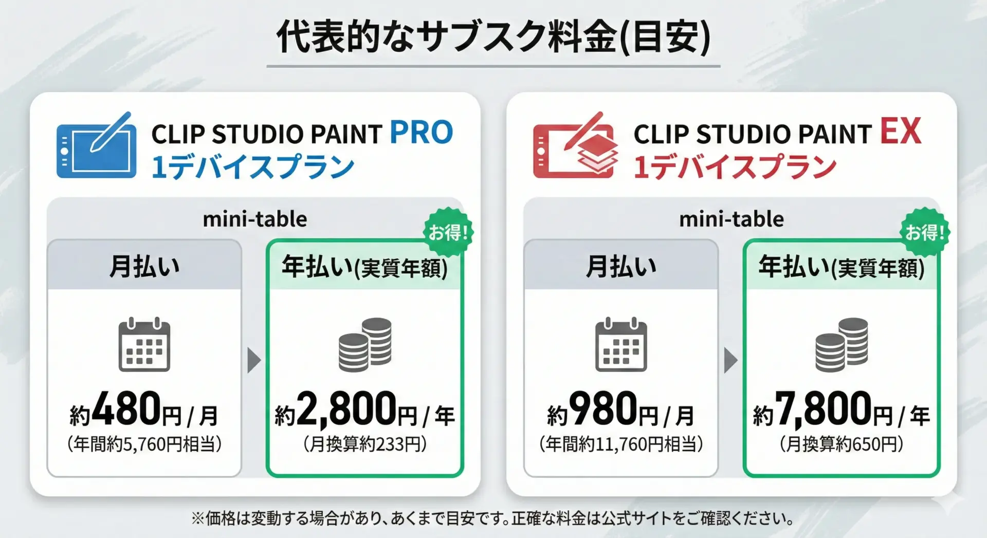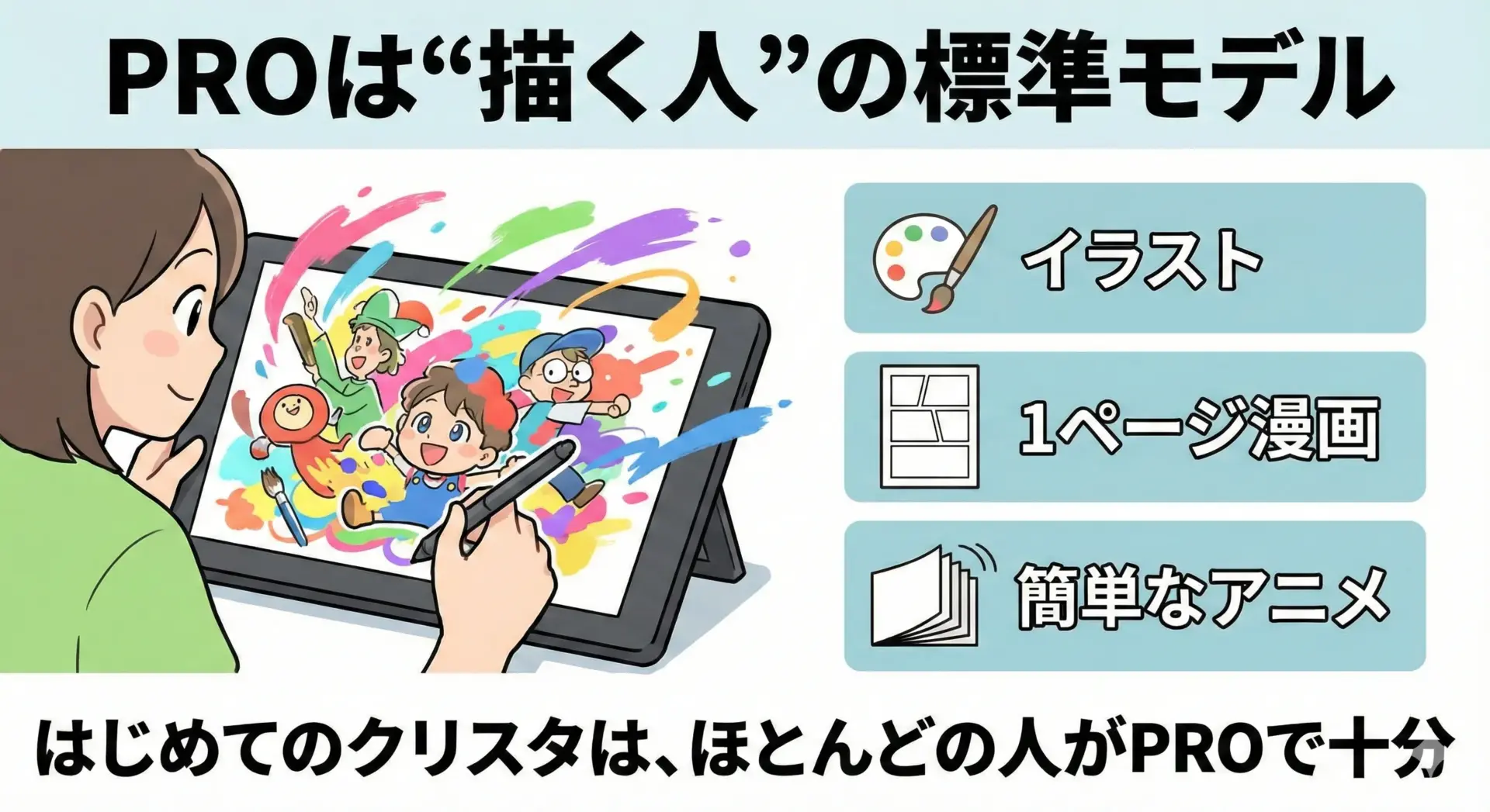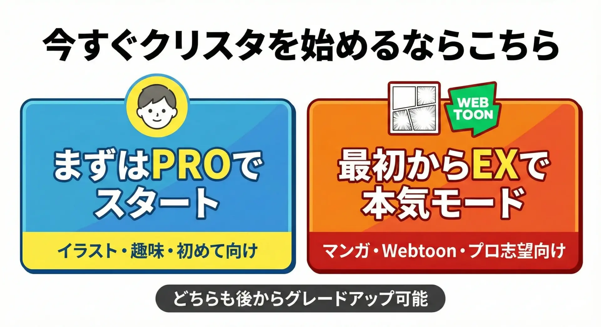 連載や同人誌を見据えるならEXが現実的、一枚絵中心ならPROでコスパ最良です。