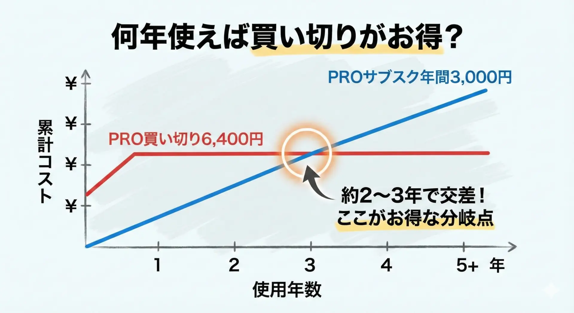 長く腰を据えて使う前提なら、PROは1年超、EXは3年程度の継続で買い切りがコスパ優位になります。