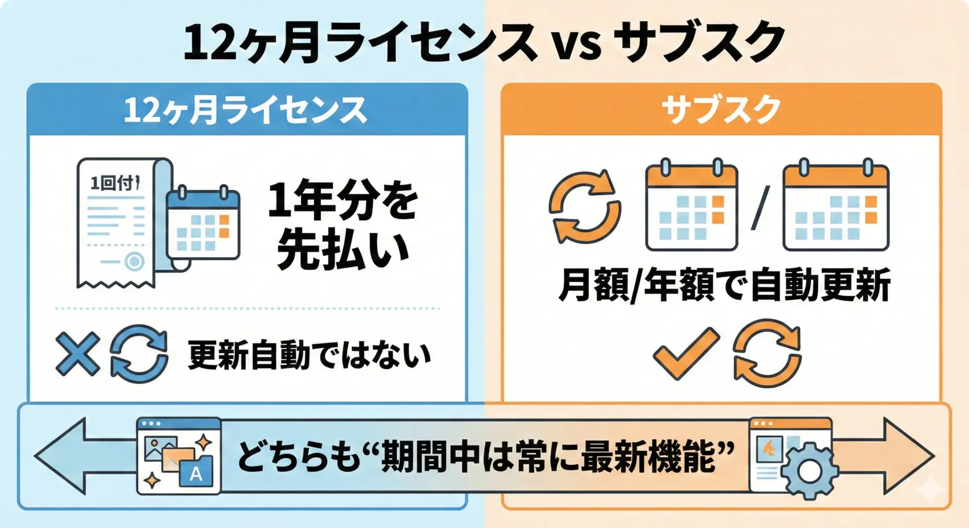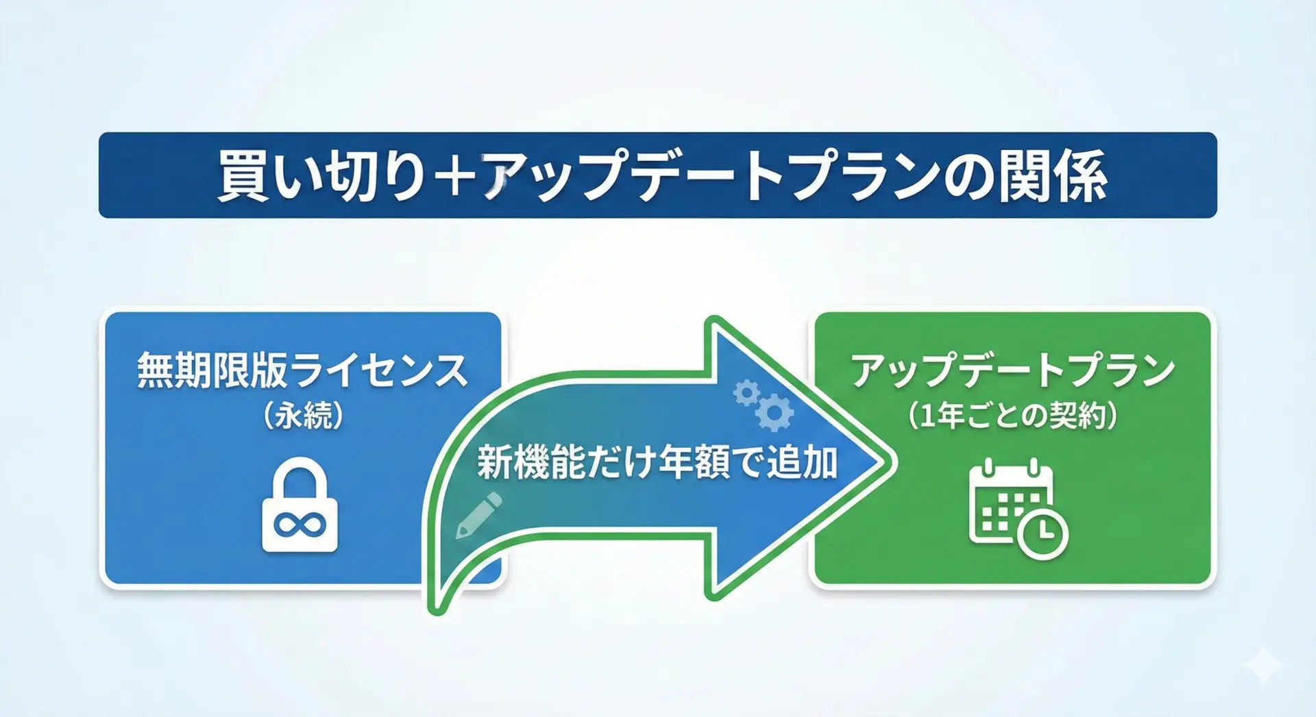 買い切りは購入時点のメジャーバージョンを無期限利用できますが、将来の大型アップデートで別途費用やアップデートプランが必要になるケースがあります。