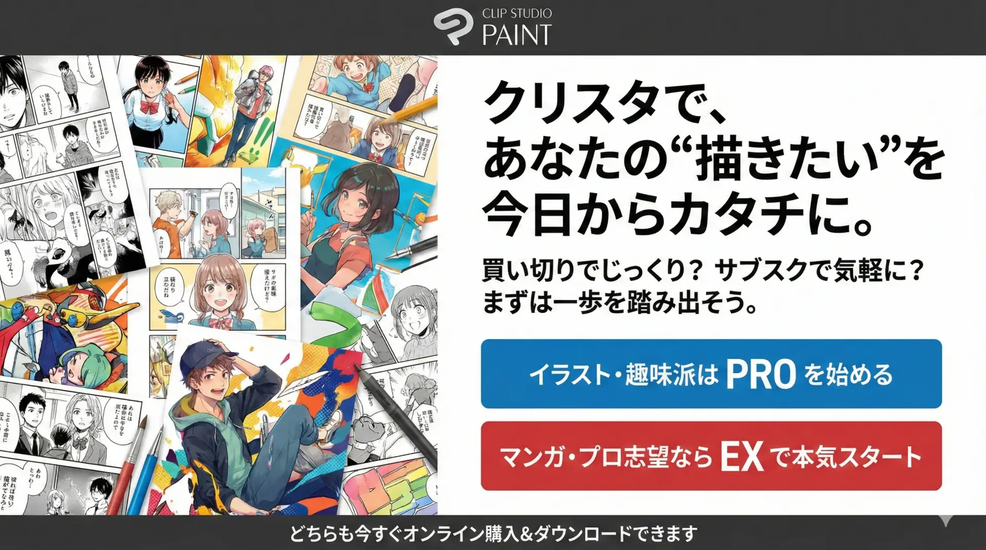CLIP STUDIO PAINT(以下クリスタ)はエディションがPROとEXの2種類、購入方法が買い切り(無期限版)とサブスク(月額/年額)の2通りです。