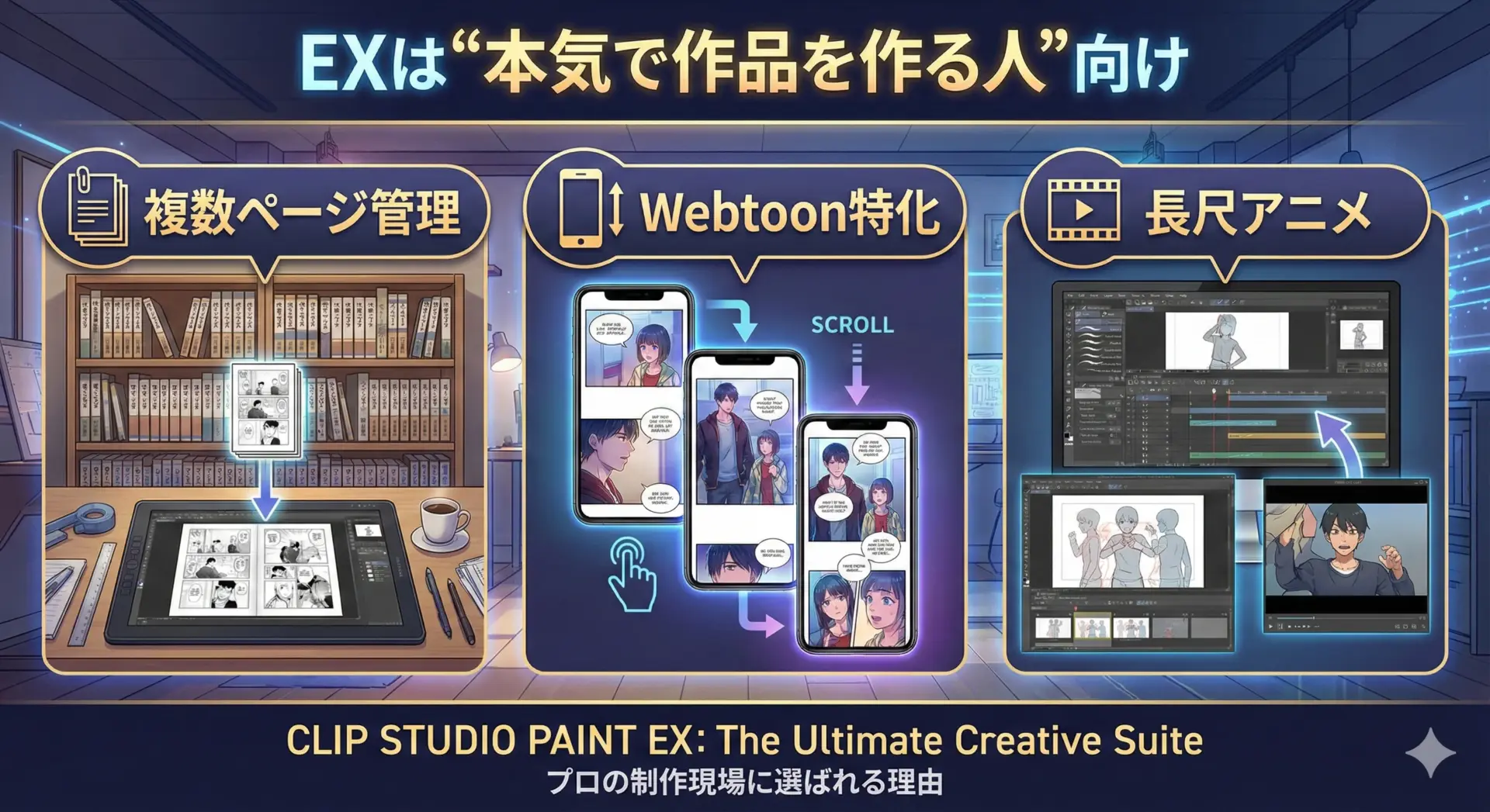 漫画・同人誌・商業案件・長尺アニメなど複雑なワークフローではEXが時間コストを劇的に削ります。