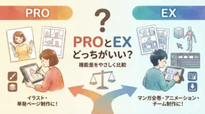 連載や同人誌を見据えるならEXが現実的、一枚絵中心ならPROでコスパ最良です。