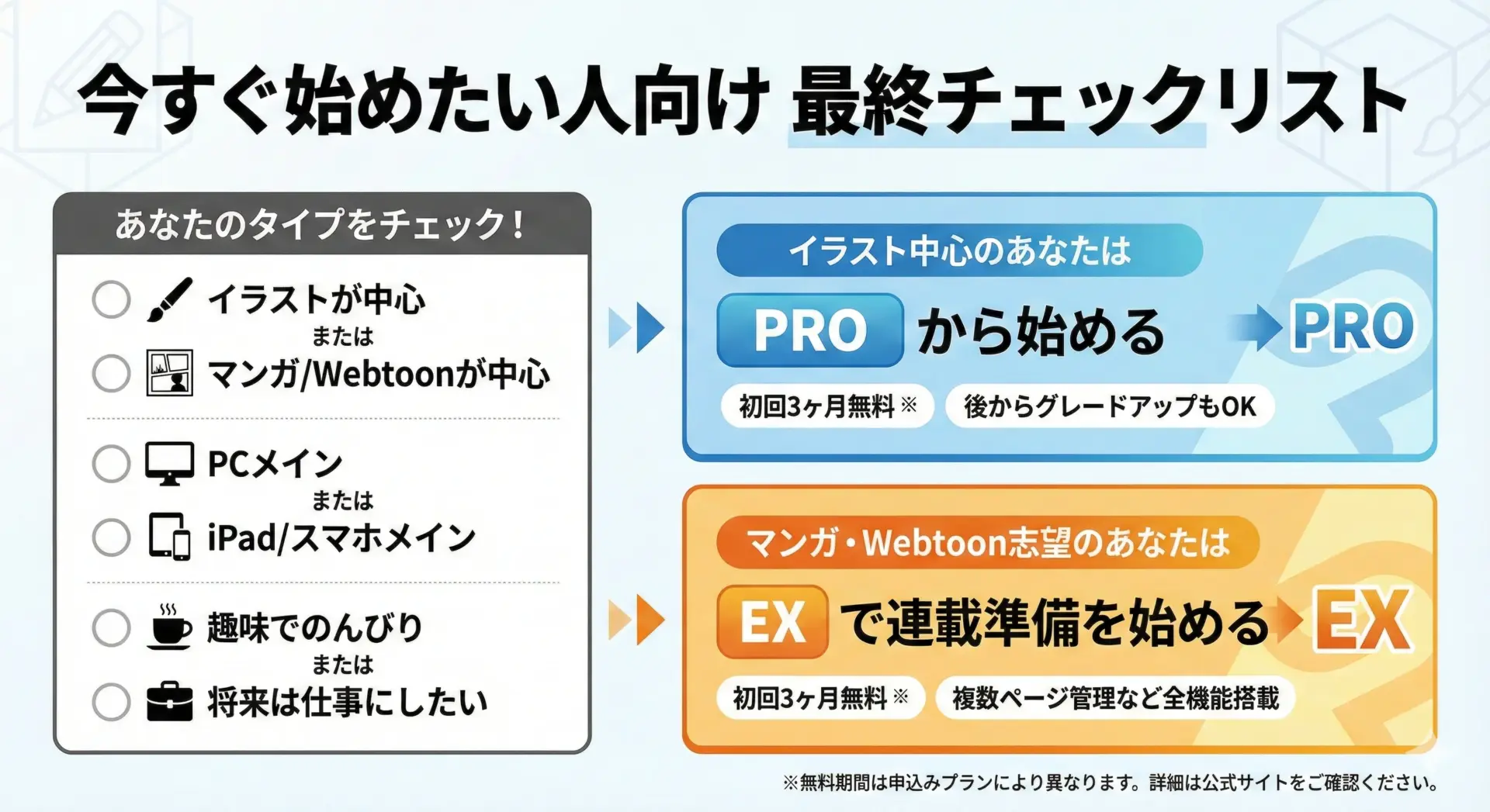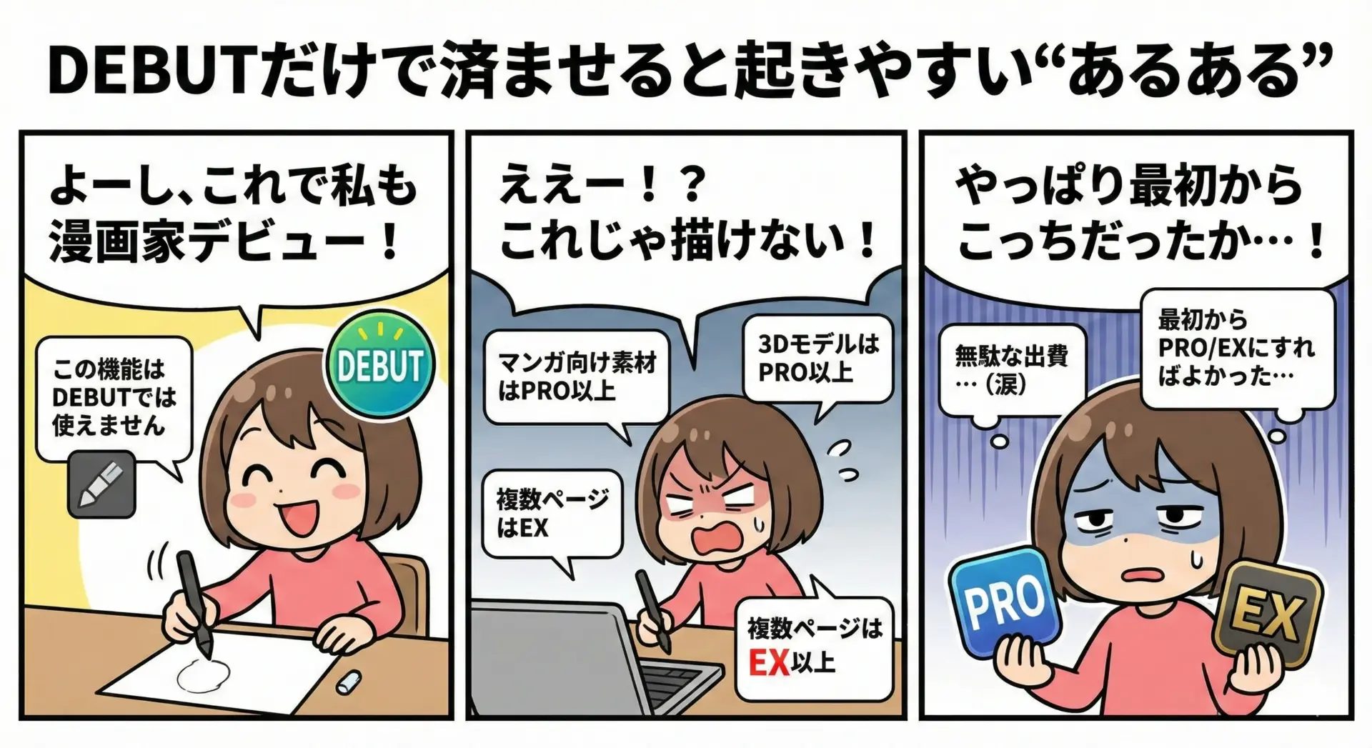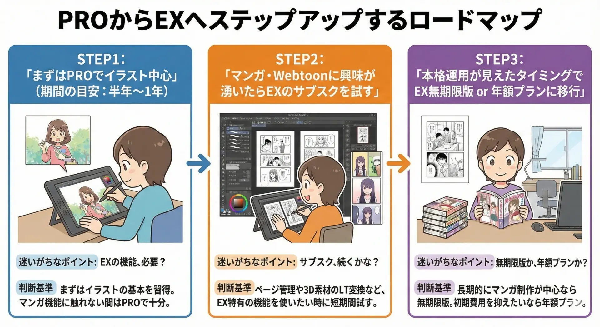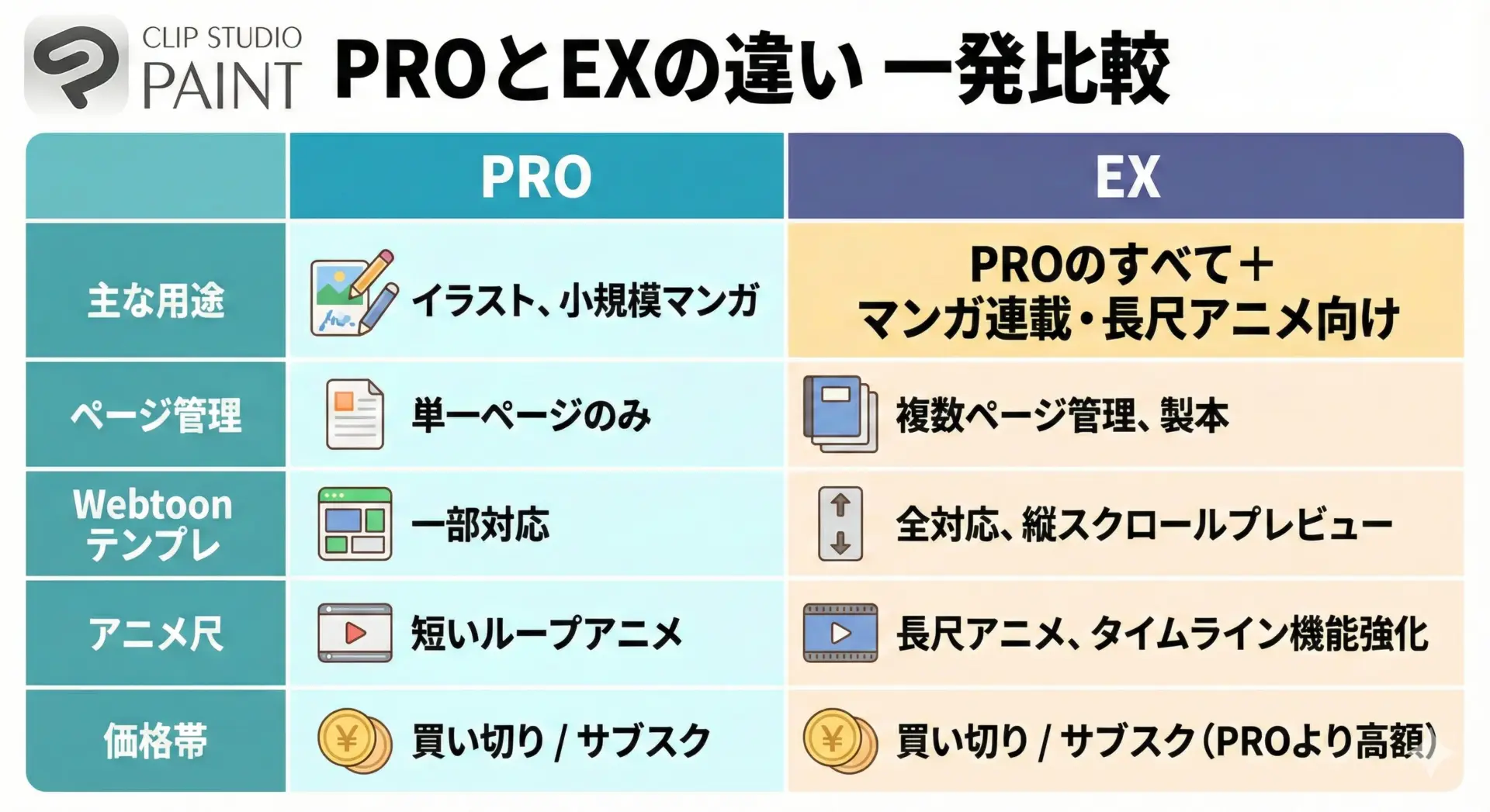 イラスト中心ならPRO、漫画・長尺アニメや複数ページ管理が必要ならEX。