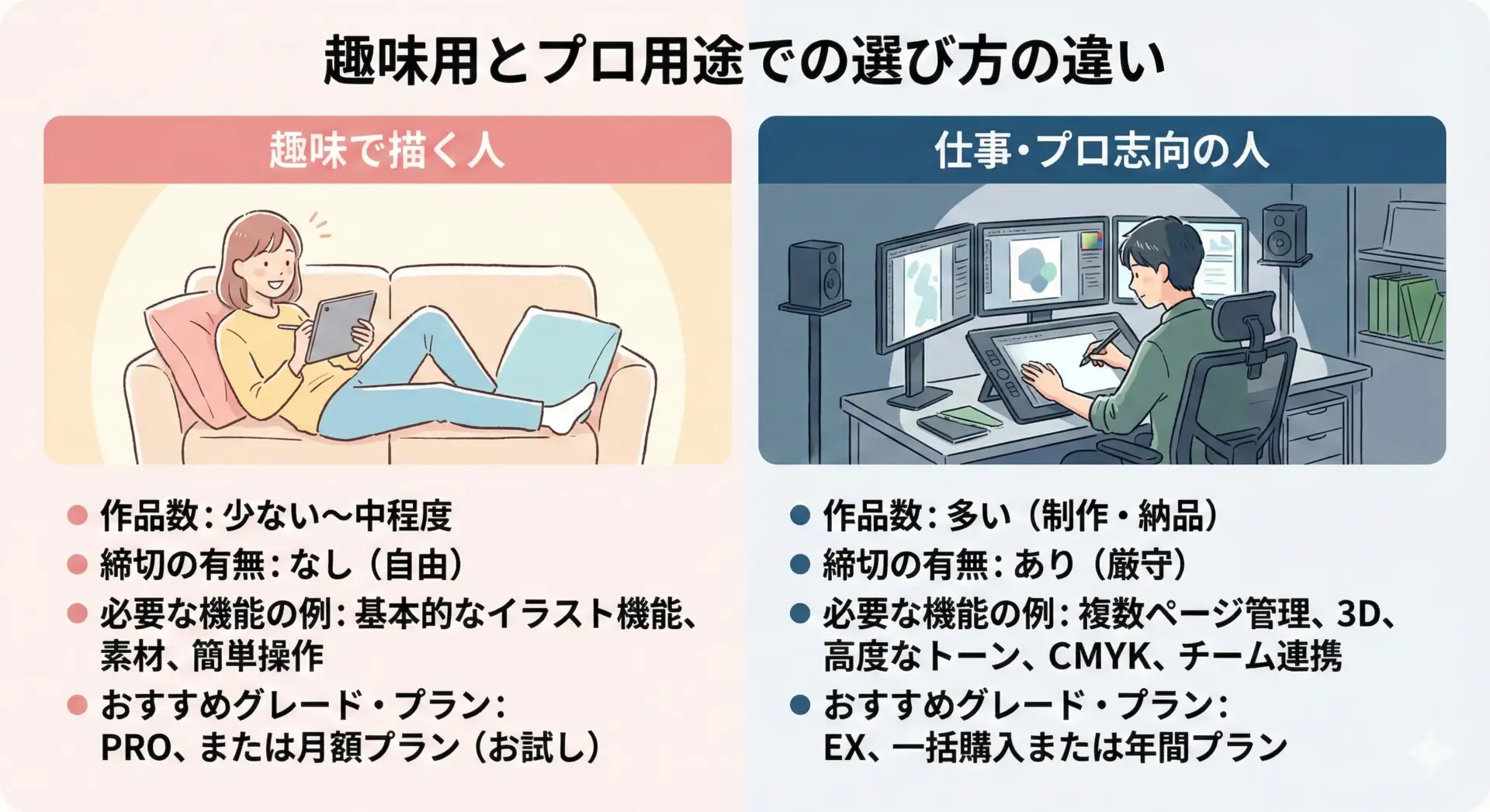 イラスト中心(単ページ)ならPRO、本格的な漫画制作やアニメ制作を視野に入れるならEXが堅実です。