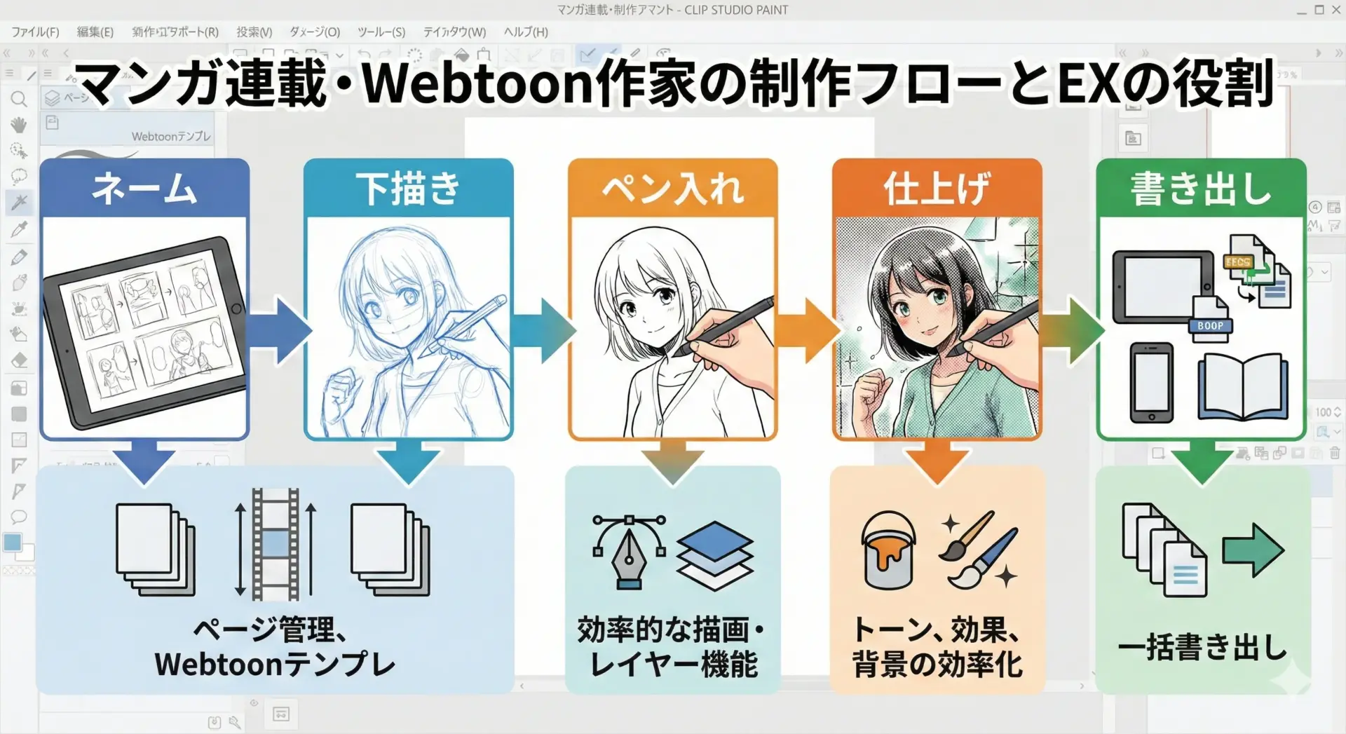 複数ページの漫画制作、長尺のアニメーション制作、ページ管理や一括処理などの本格的な制作ワークフローはEXが得意です。