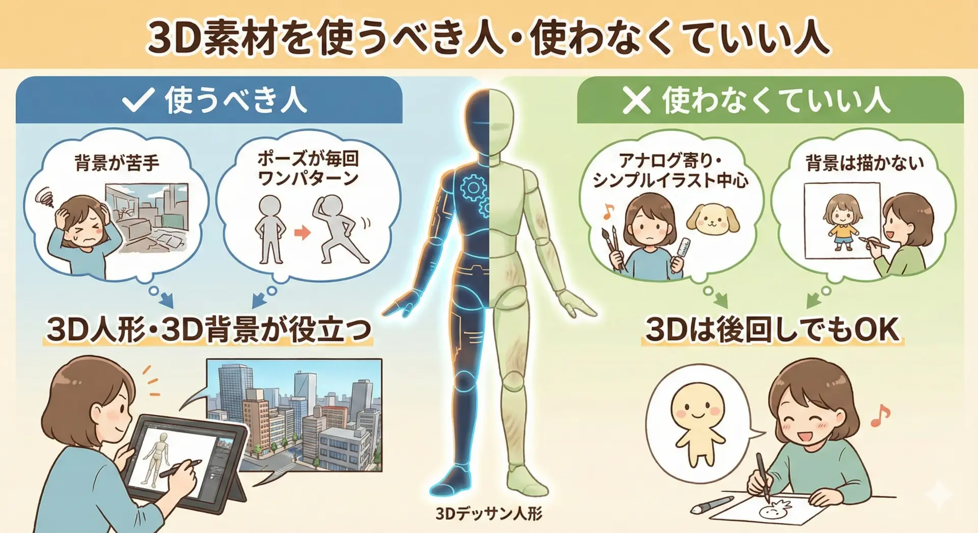 | 3D/アニメも併用 | 16 GB以上 | 高速SSD | 3Dはラフ用に、最終はラスタ化 |