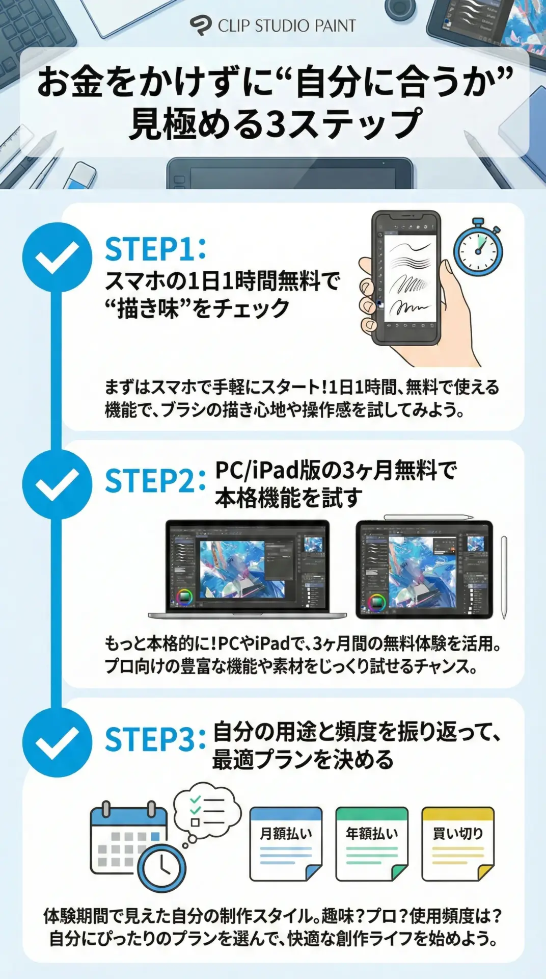 購入前に、体験版で普段のキャンバス/レイヤー/素材を再現して快適性を確認しておくと、導入後の満足度が高まります。
