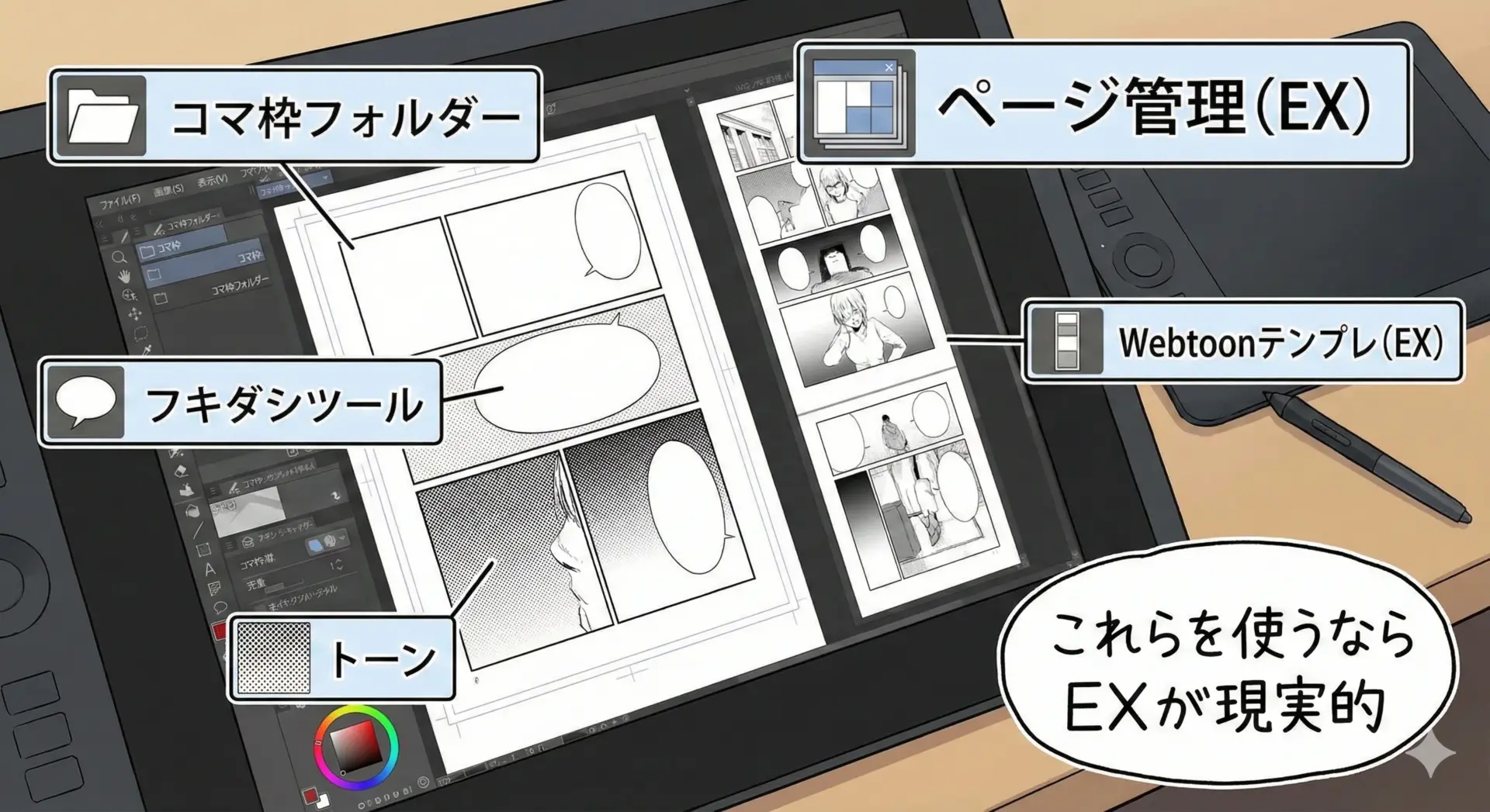 漫画や同人誌の複数ページ管理、長尺アニメーション、印刷や書き出しの本格運用まで視野に入れるならEXがベストです。