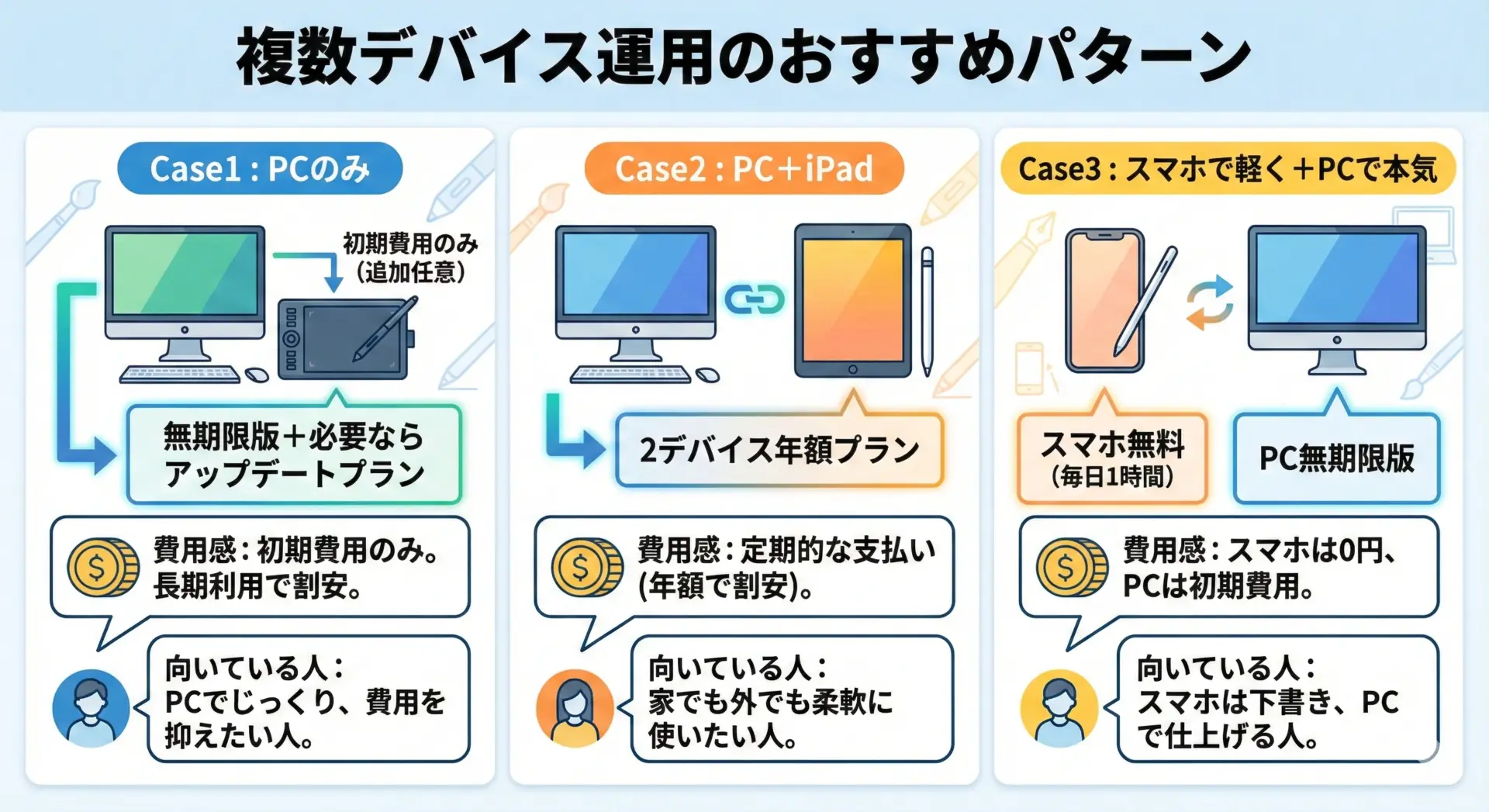 PCのみなら買い切りや単体プランで十分な場合がありますが、PC+iPadなど複数端末での制作が前提なら、マルチデバイス対応のサブスクが快適です。