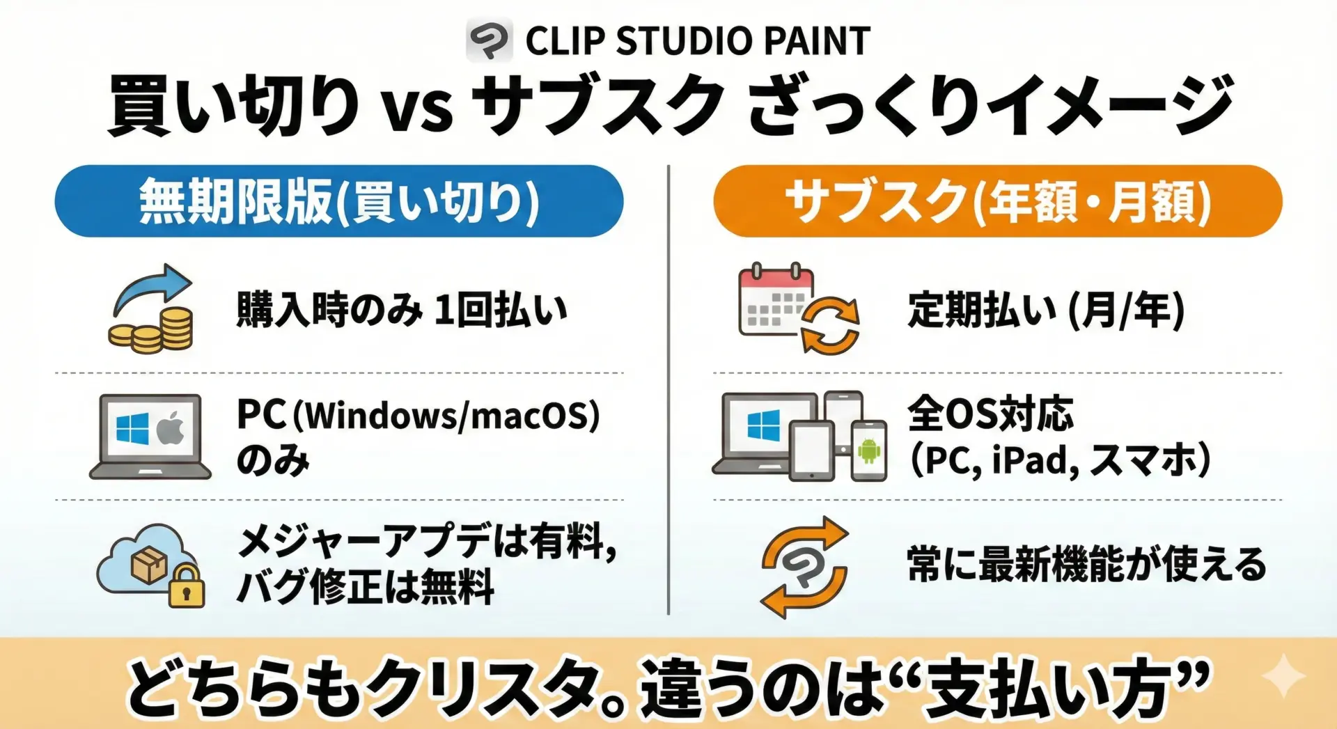 買い切りは心理的に「完了」感がありますが、将来のメジャーアップデートやOS更新との兼ね合いで、追加費用やバージョン移行の判断が必要になる場合があります。