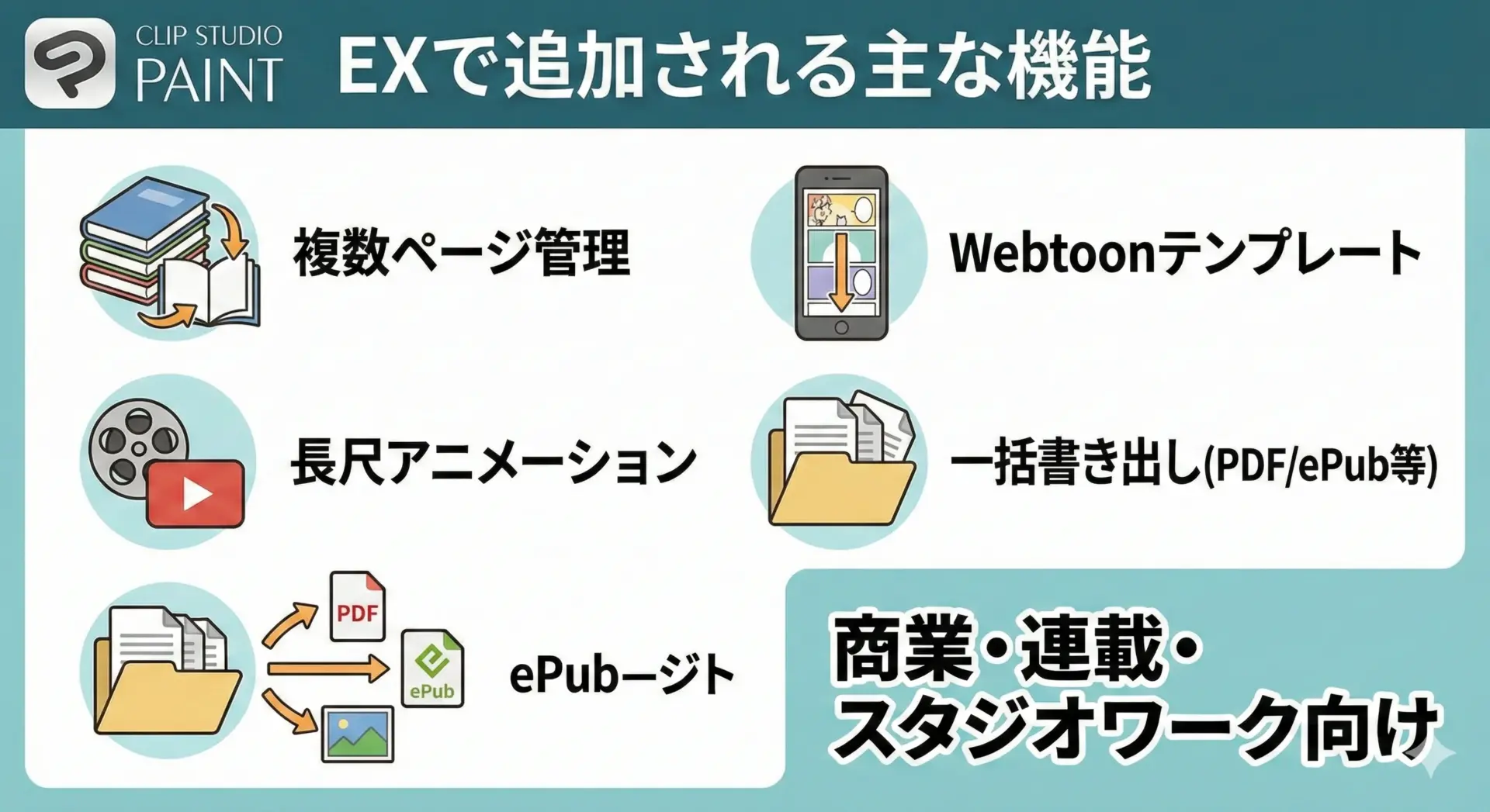 EX版は、PROの全機能に「本格的なマンガ・Webtoon・長尺アニメ制作」機能を加えた上位版です。