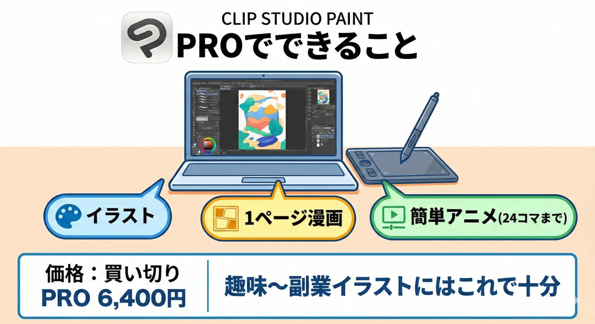 PRO版は「イラスト・1ページ漫画・簡単アニメ」をメインにする人向けのグレードです。