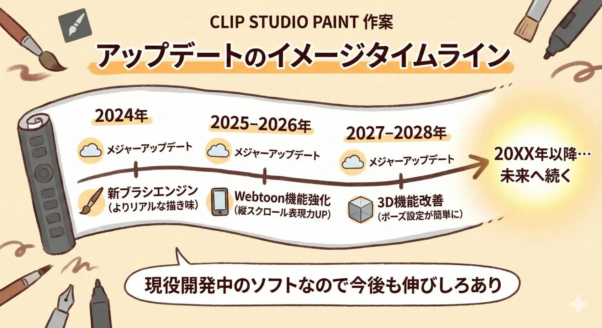 クリスタはいまも現役バリバリで開発が続いているソフトで、アップデート頻度は比較的高めです。