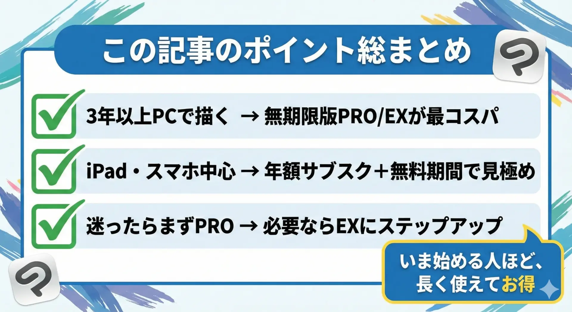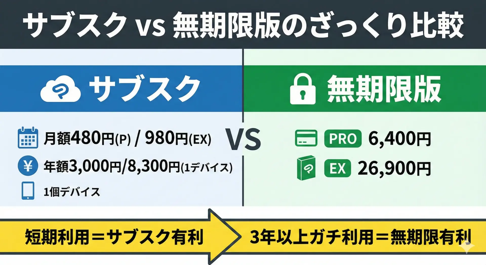 - PCで長く使うなら無期限版PRO/EXが圧倒的にコスパが良いこと、