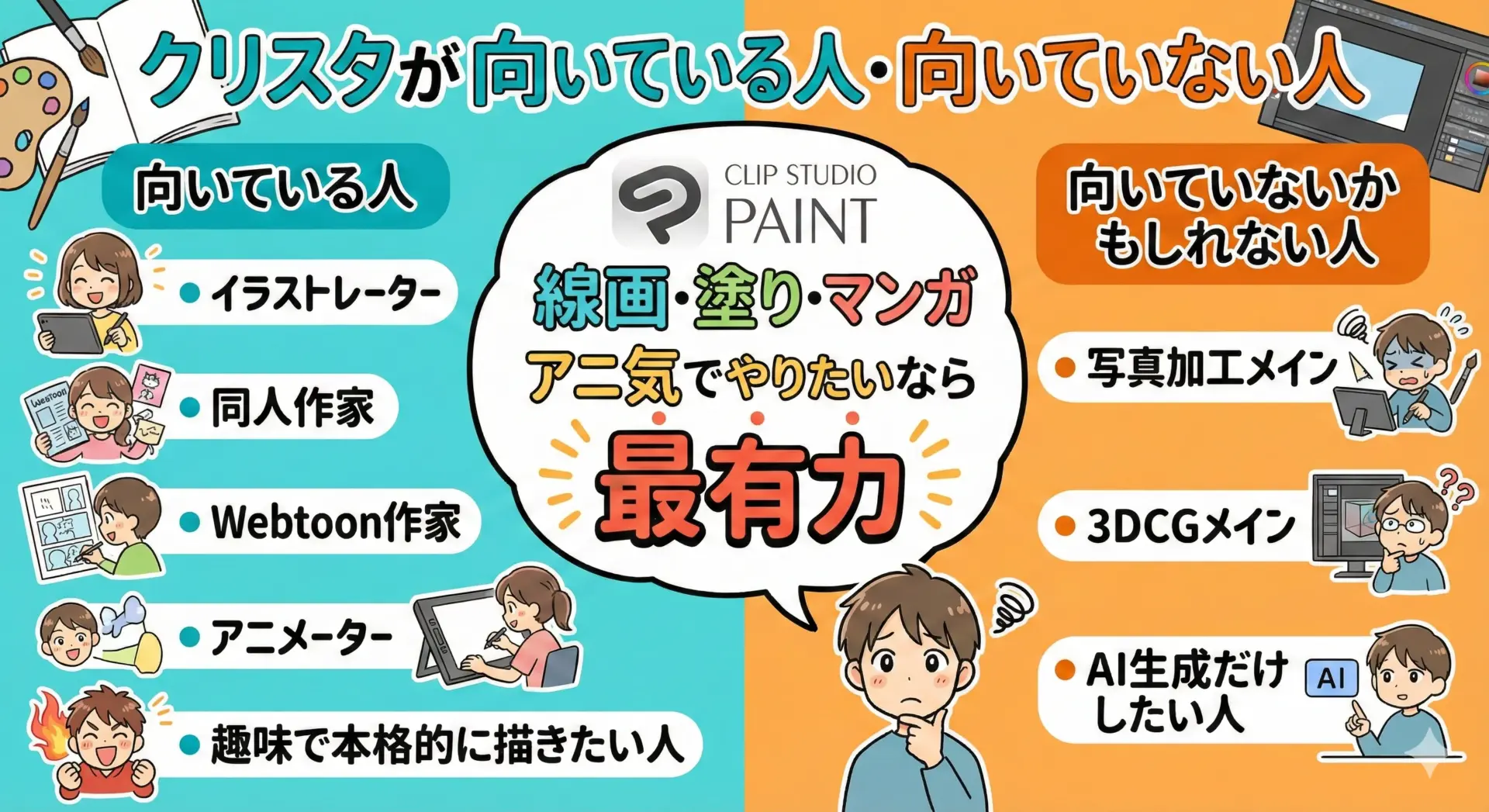 CLIP STUDIO PAINT(クリスタ)は、日本のセルシス社が開発した「イラスト・マンガ・Webtoon・アニメーション制作」に特化したグラフィックソフトです。