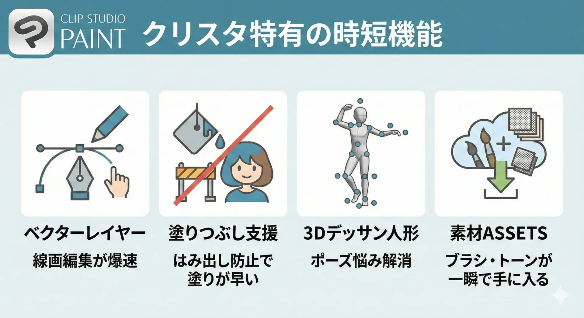 クリスタはそれを1本で完結できるため、「価格以上のリターンを得やすい」構造になっています。