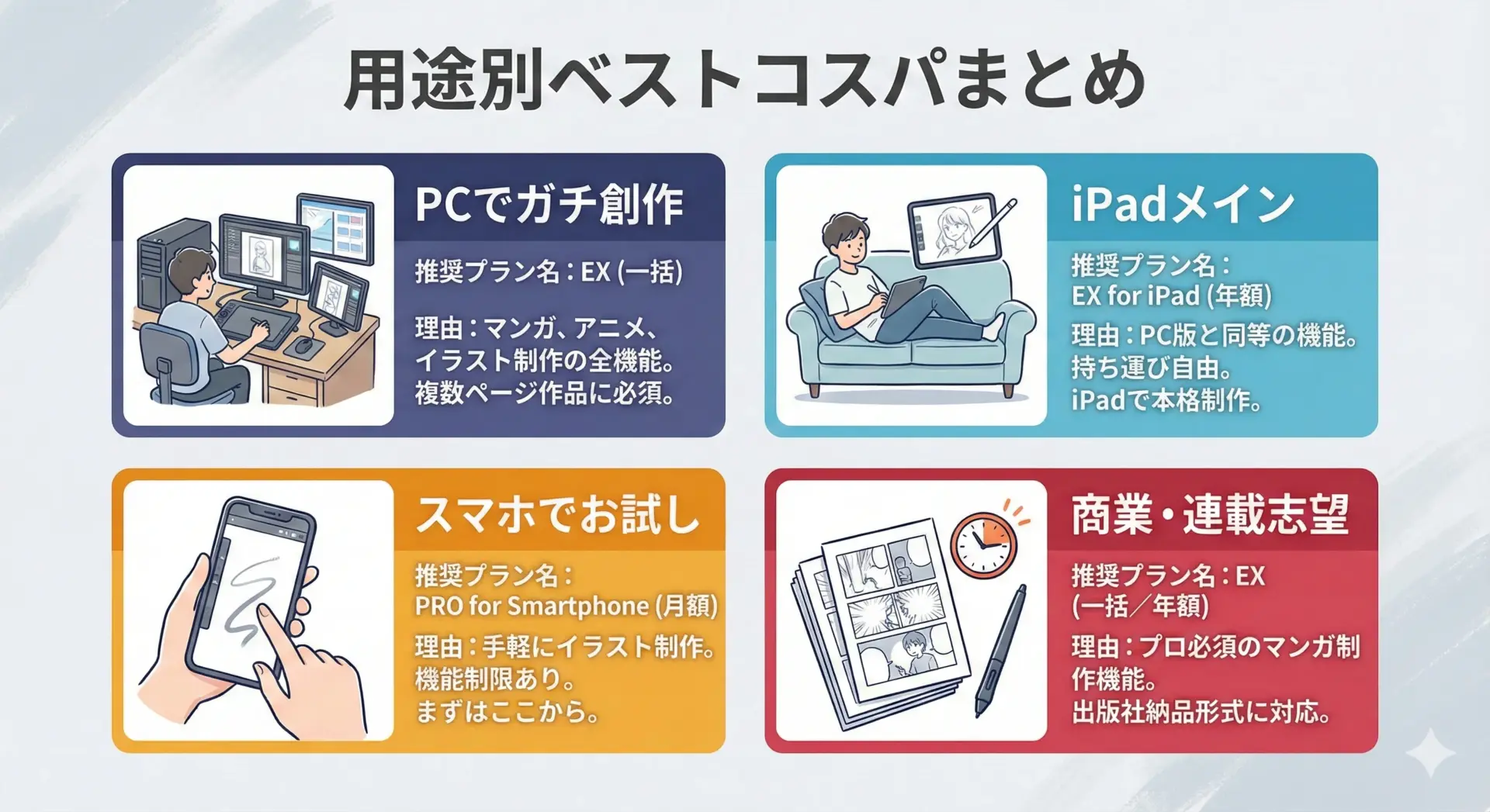コスパ観点での結論を、用途別に整理すると次のようになります。