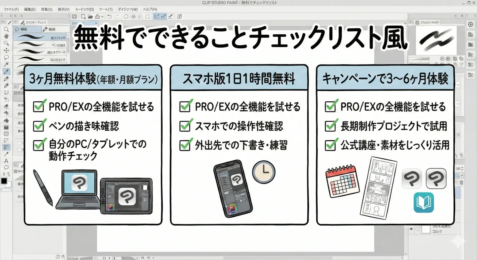 無料体験期間中に、普段描く解像度・レイヤー枚数・3Dの有無でテストしておけば、購入後に「重くて使えない…」と後悔するリスクはかなり減らせます。
