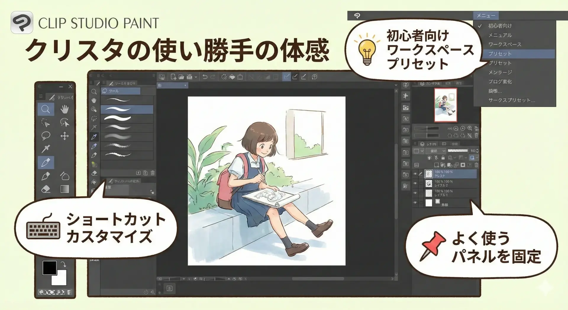 - ワークスペース(パネル配置)のプリセットが用意されているので、「イラスト用」「マンガ用」など目的別に切り替え可能