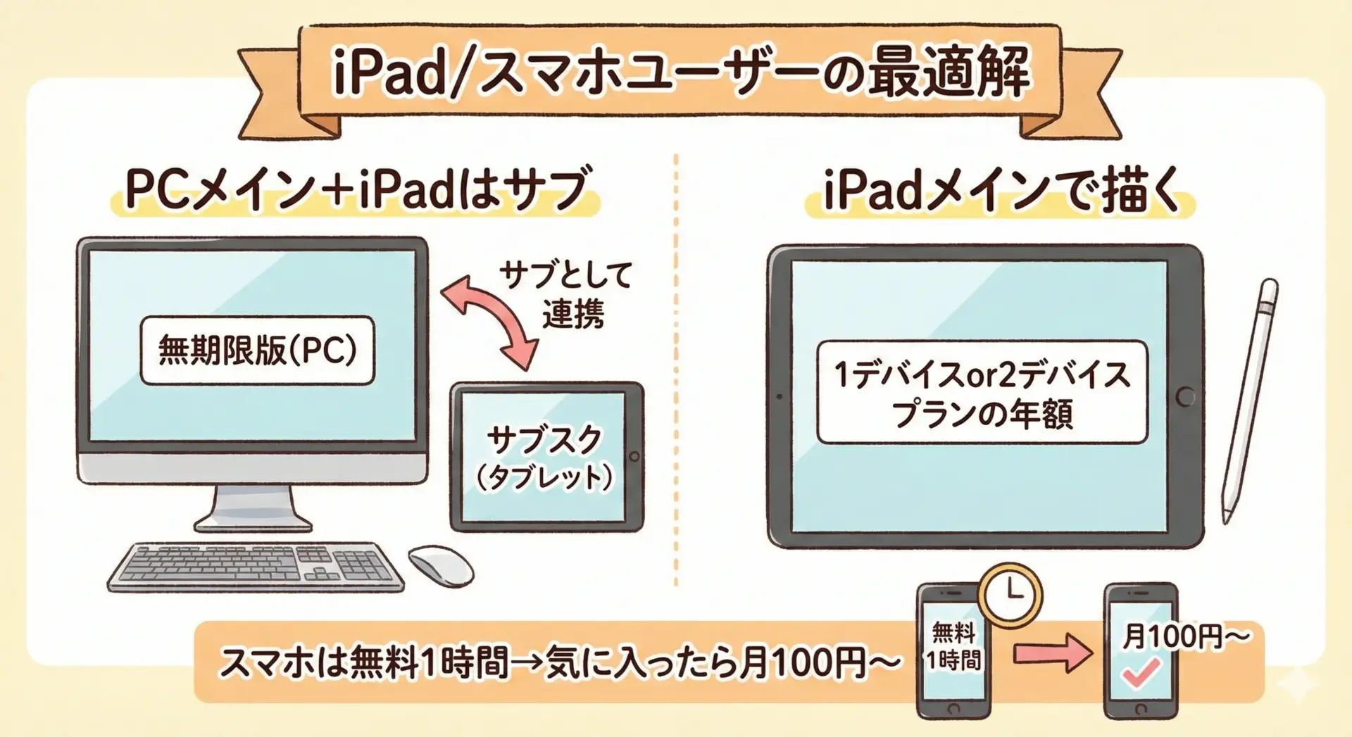 → 3年以上使うなら、PC無期限版+iPadサブスクのハイブリッド構成も検討の価値あり - スマホだけで描くライトユーザー