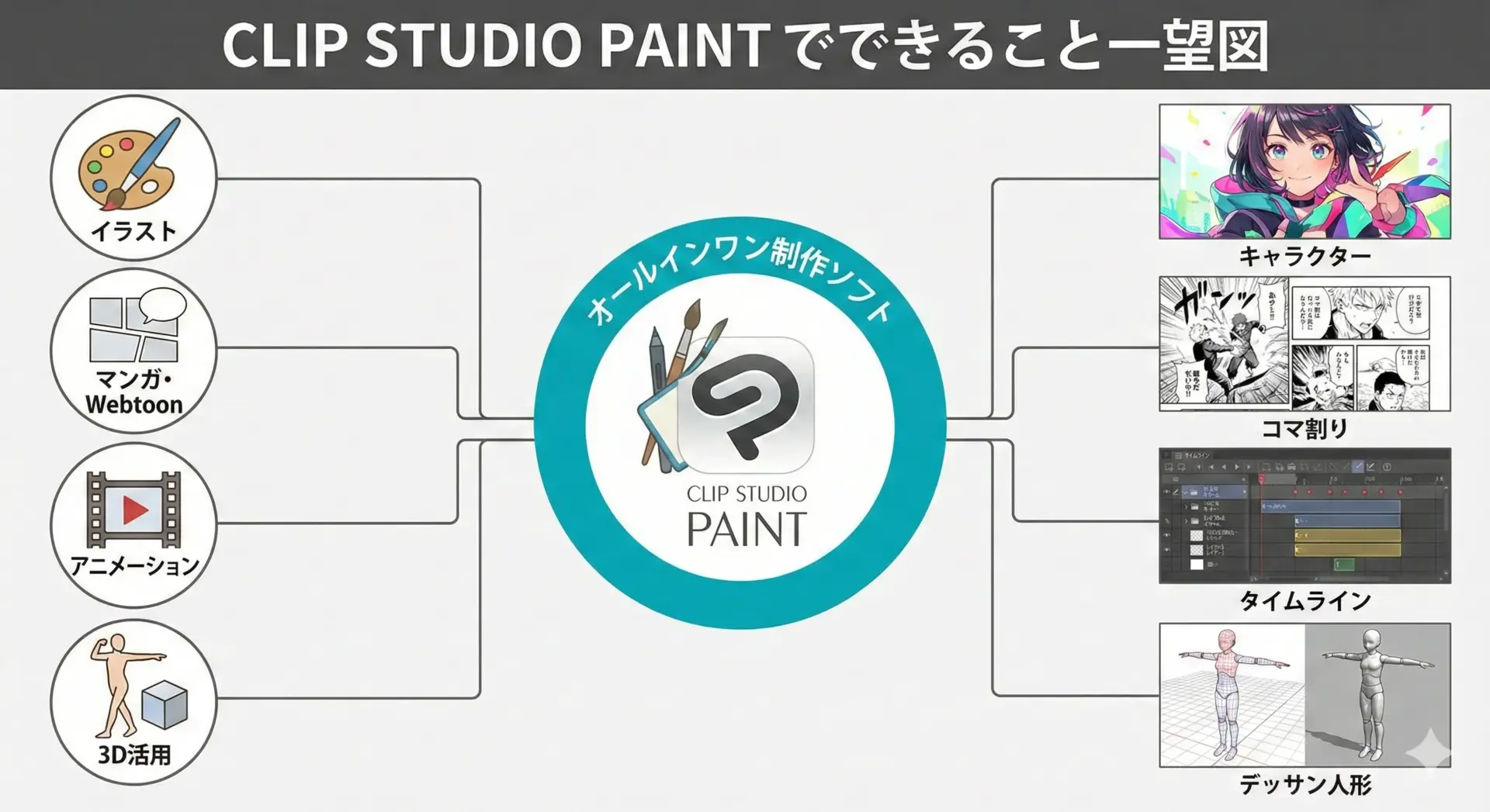 - CLIP STUDIO PAINTは、イラスト・マンガ・Webtoon・アニメを1本でこなせるオールインワン制作ソフトであり、