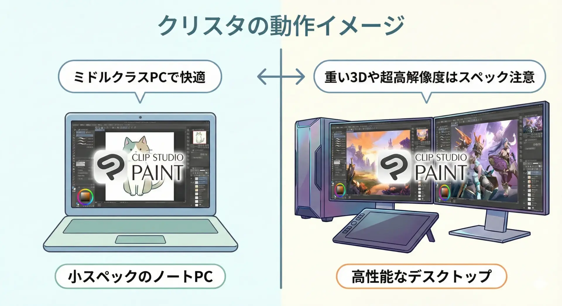 もちろん、PCスペックが低すぎると快適とは言えませんが、「クリスタだけ極端に重い」というケースはあまり聞きません。
